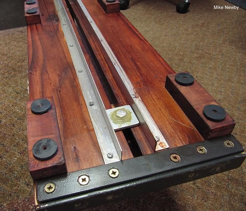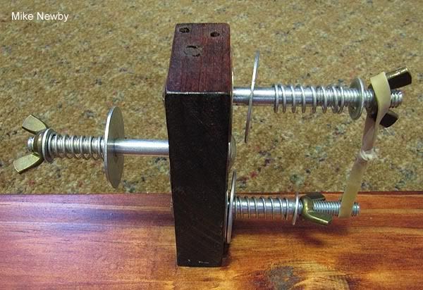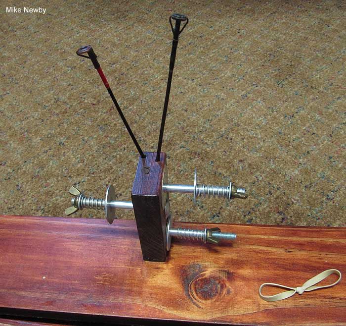 In the previous pic you'll see I drilled two holes in the top of the thread holder, at slight angles. That is for old rod-tips...I put those in, and the thread comes off the spool then, up through the rod-tips, and then down to the rod blank you are working on. This gives you good control over the thread tension should you move back a turn or so, plus provides the correct angle for the thread coming down to the blank, from the rod-tips. (You can even use piano wire (even better), and glue rod tips to it. Or very stiff wire, whatever...make a plan...as they say).