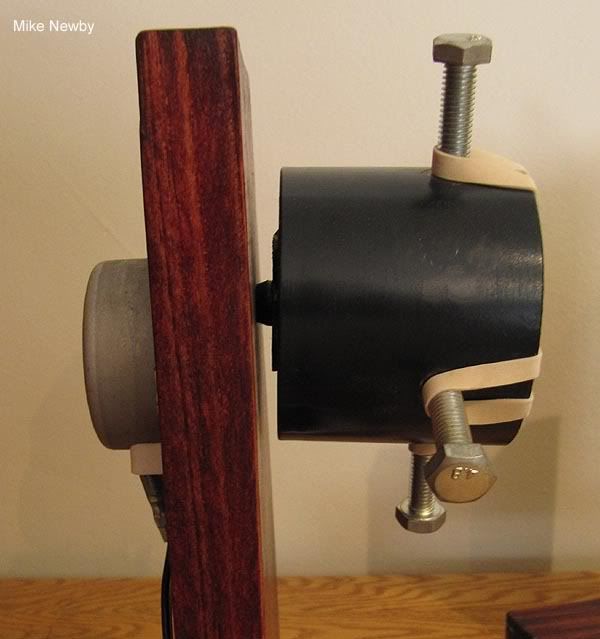 a Hole is drilled right through the stand, and the mocrowave motor is secured to it, with it's shaft going through the hole.